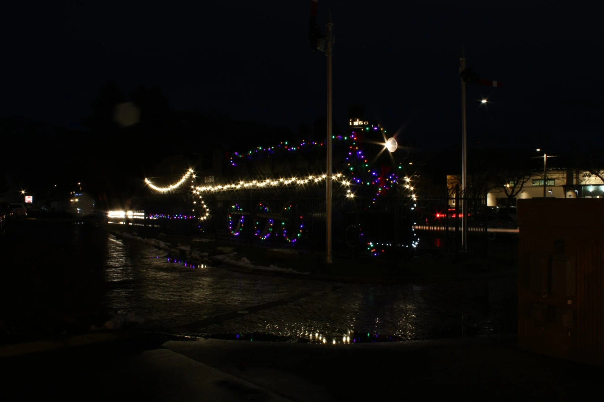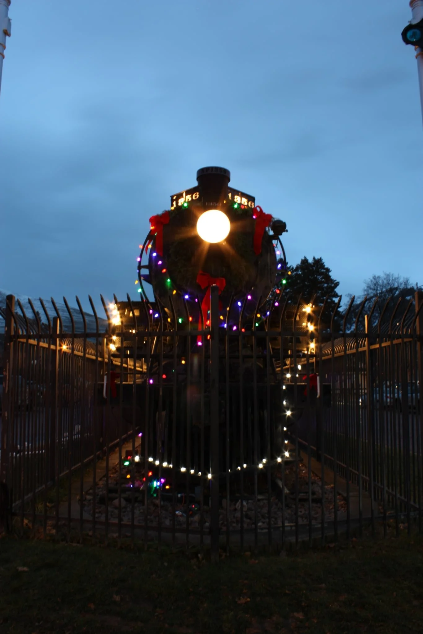 Engine 1356 got her electrical installation done this year, so we can now have the headlight and number boards lit, lights for signage, and more. In celebration she got a holiday wreath and garland and Christmas lights—and her headlight and number boards shining shine for the first time in 70 years! Scott Wolff installed solar panels to keep the semaphores lighted all year.